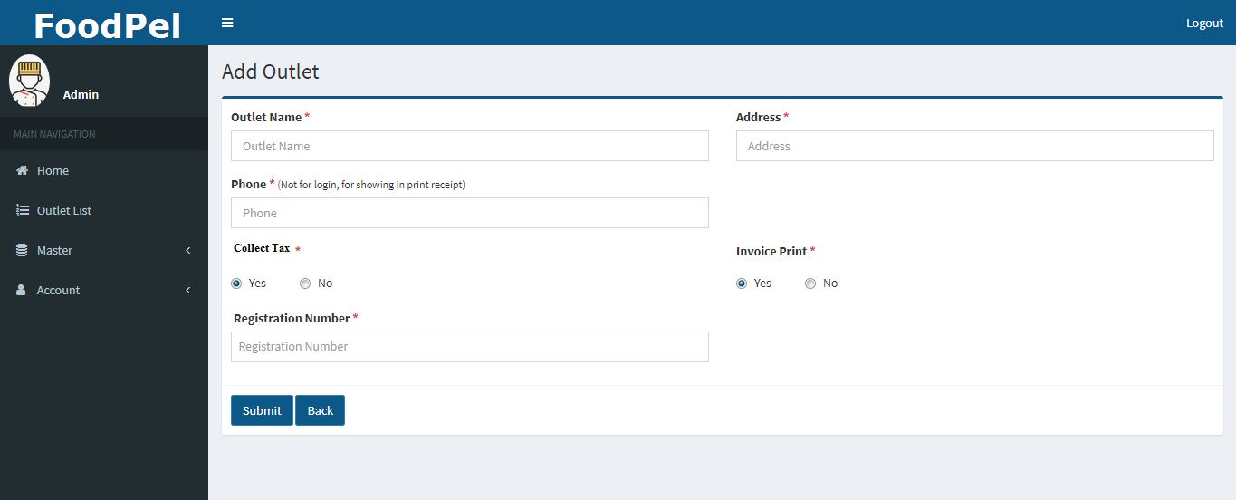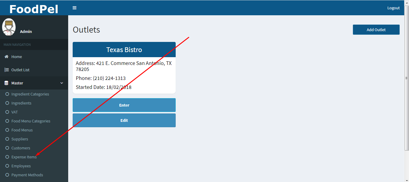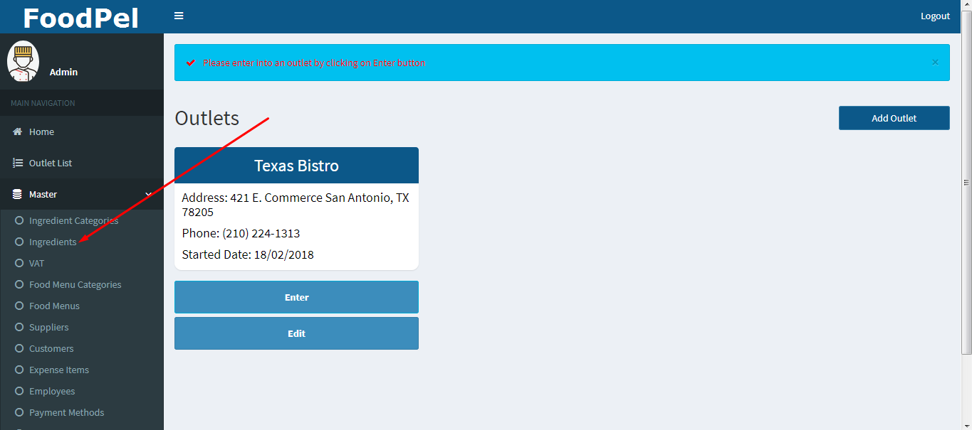 Like purchase, sale, waste, expense, supplier payment, inventory; we are calling these as operations. So to enter information of an operation like you want to put e purchase entry, you have to Enter into an outlet. And every calculation is based on an outlet, so you want to check status of an outlet, you have to enter to that outlet. But for a non-admin user, he will be redirected to an outlet where he is assigned.