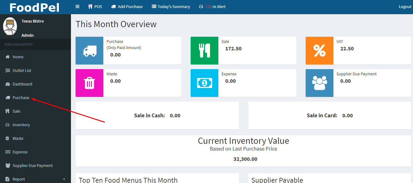 You can call our Dashboard as Business Intelligence Dashboard, it you show you your business at a glance like: Monthly Summary of all operations, your current stock value, your top ten food menus, suppliers due and your montly sale comparison